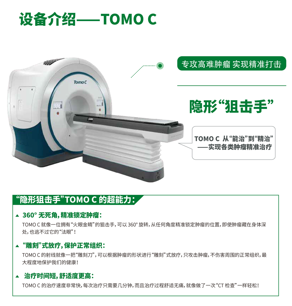 TOMO是复杂和疑难肿瘤病例的克星。它螺旋断层照射方式,实现一次照射多个肿瘤病灶,降低了正常组织受到反复照射的风险。并且应用广泛,可以治疗身体各个部位的肿瘤。